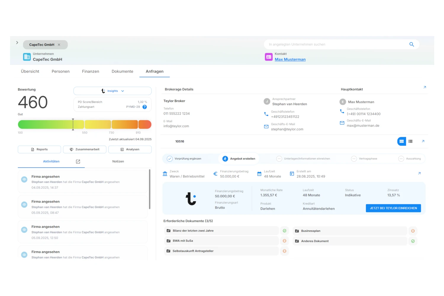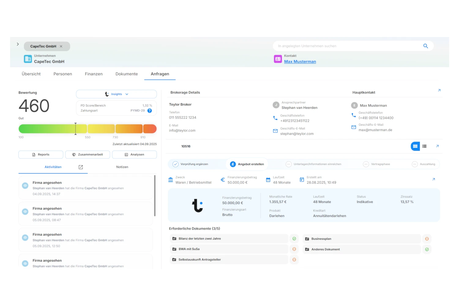 Mit Teylor.Match werden Kunden- und Anfragedaten digital erfasst, geprüft und angereichert inklusive Bonitätsinfos, Dokumentenauswertung und Risikoparametern. So entsteht eine fundierte Datengrundlage für eine medienbruchfreie, effiziente Weiterverarbeitung.